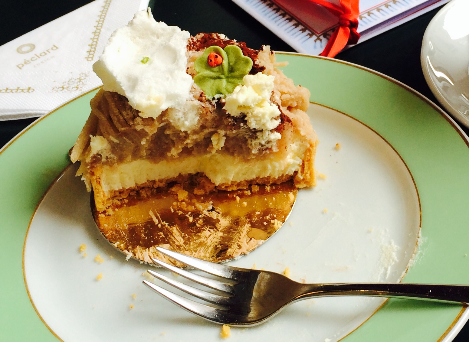 Mont Blanc: this dessert is traditionally made with a base of sweet pastry, topped with puréed sweetened chestnuts and whipped cream (resembling the real Mont Blanc). Often the chestnut puree is thinly piped like a mass of spaghetti strands. At the legendary Conditorei Schober in Zurich, they flip their layers around but who cares really, when it tastes this good?