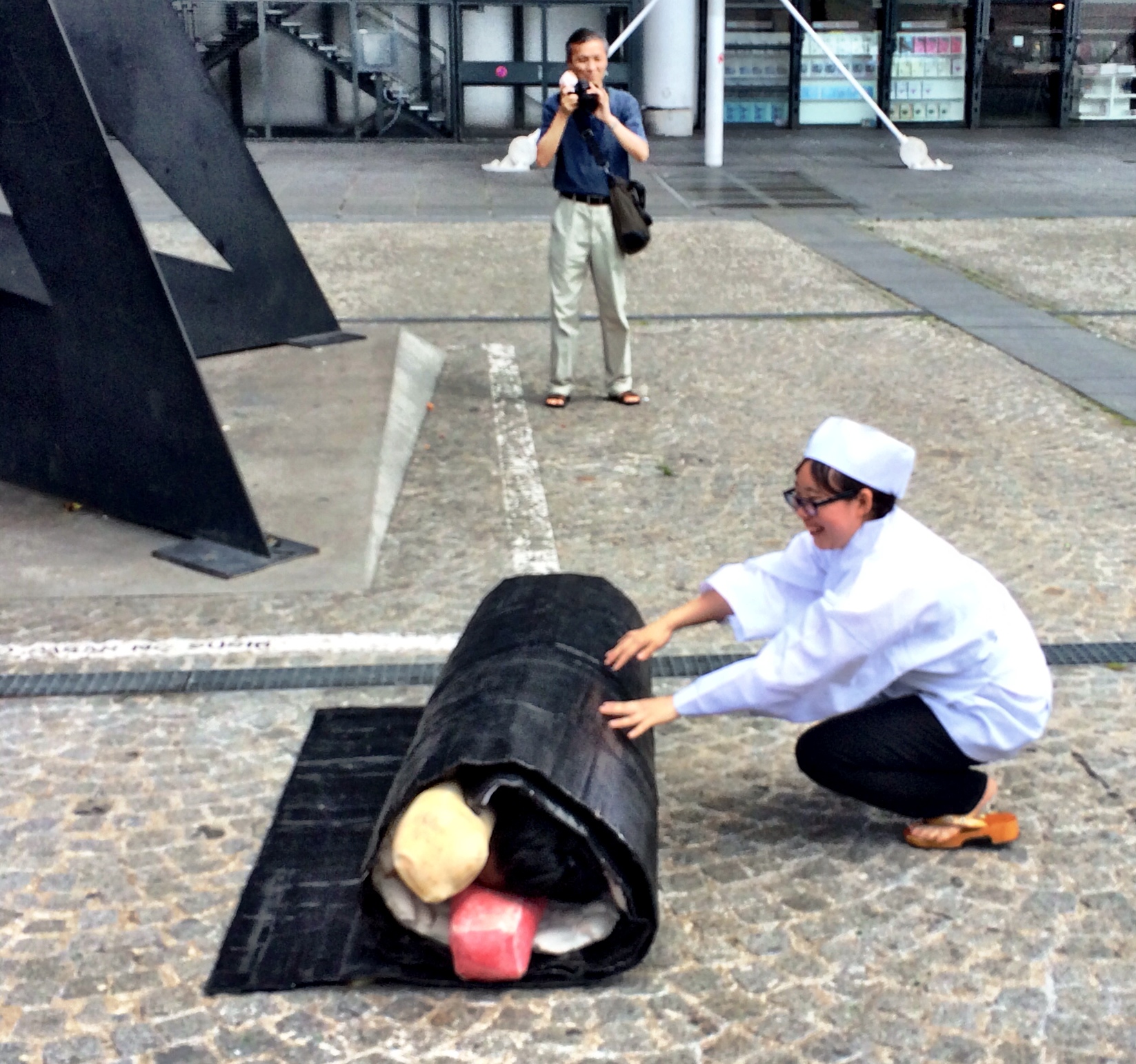 Japanese food was obviously the inspiration for this installation by art students I came across outside the Centre Georges Pompidou in Paris. Called ‘human sushi’, it invited willing participants to be rolled up into a nori roll for the a class assignment. Thankfully they stopped before any cutting and serving took place.