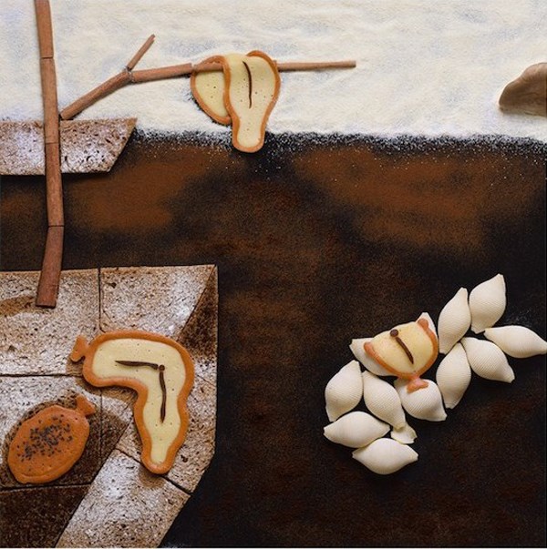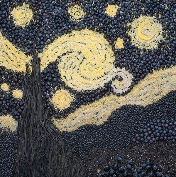 Shkondina recreates work by Van Gogh, Dali, Magritte and Klimt using a range of ingredients like grains, salmon, fruit and vegetables. She chooses artworks that are in ‘food’ colours and simple forms, draws sketches and uses food products that best match to the art by colours, textures, forms and point of origin.