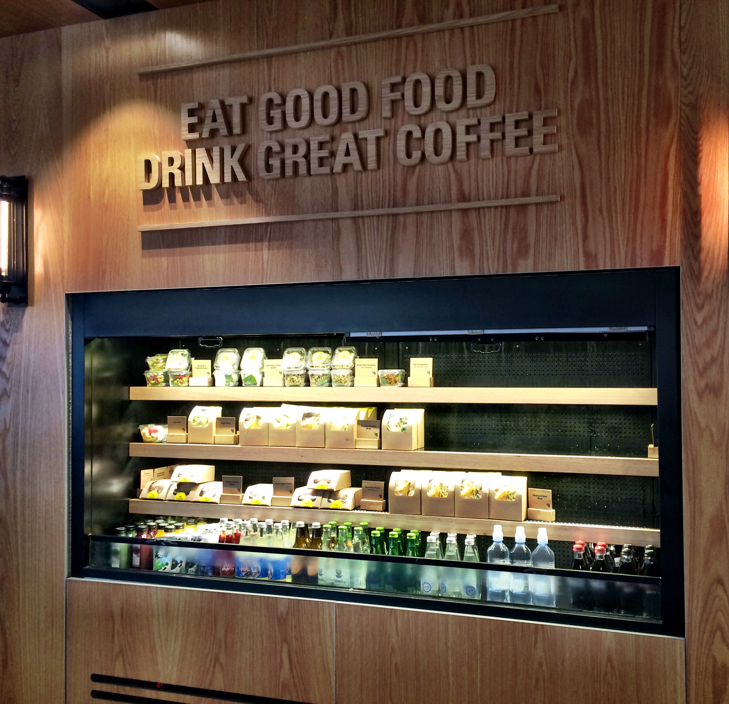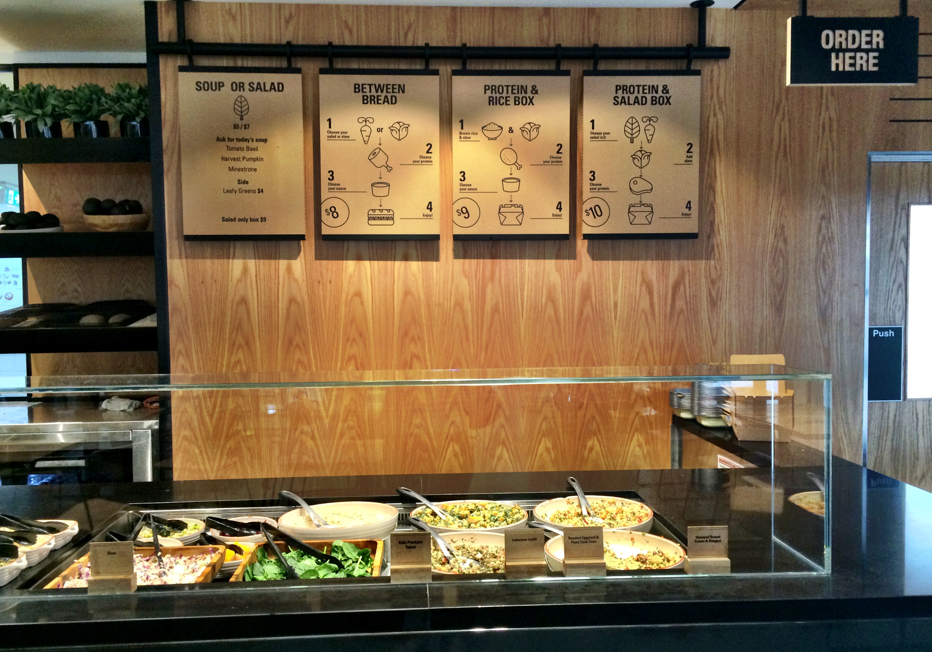 There are stations for salad, protein, sweets and coffee, along with a wall of pre-packaged goods that could have been lifted straight out of the UK’s EAT chain. A set of cute, step-by-step illustrations demonstrate how to build your own box from the selection.