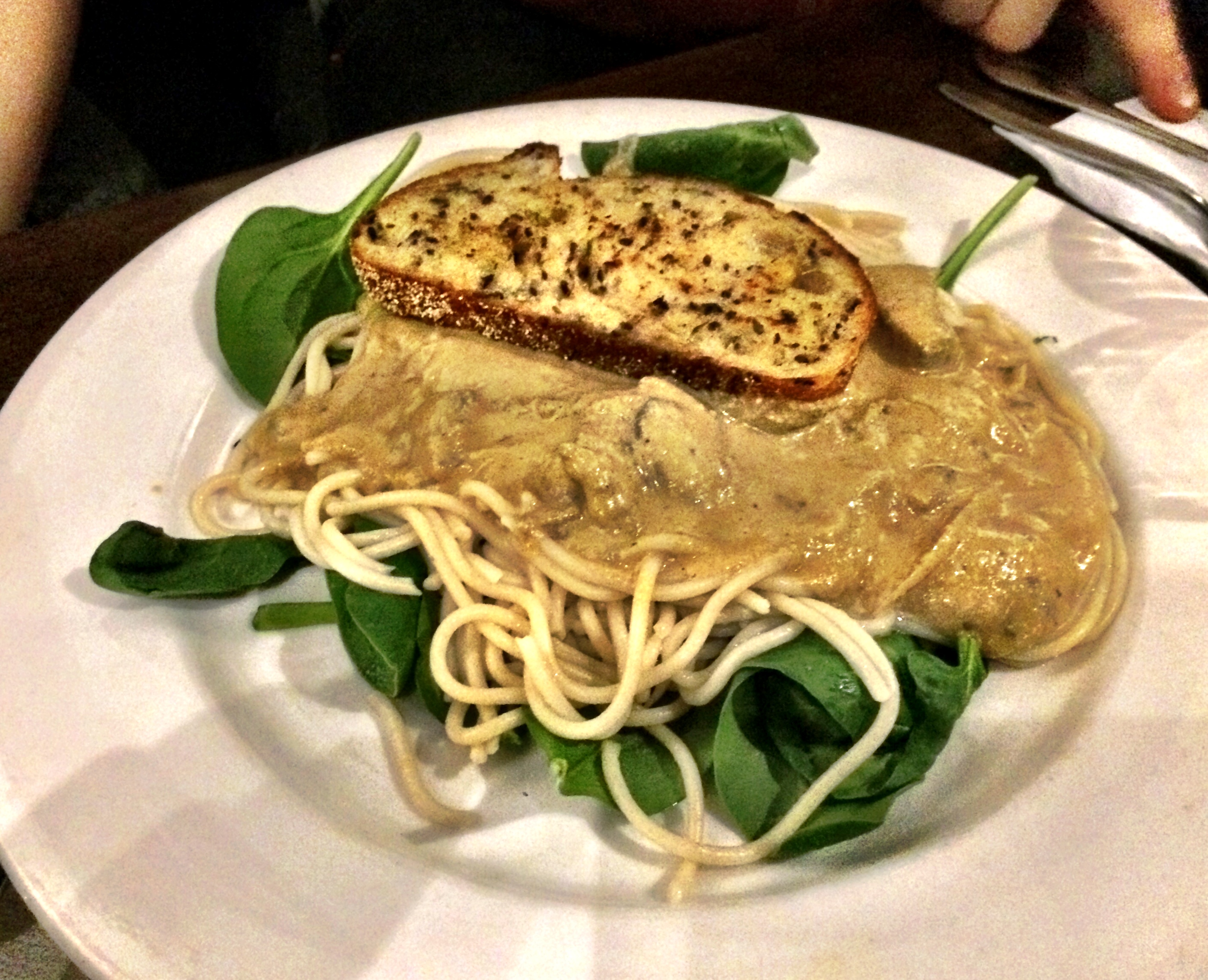 My tagine reminds me exactly of something I would make at home mid-week, meaning it was tasty but not amazing. A bite of Ving’s pasta reveals a similar story there.