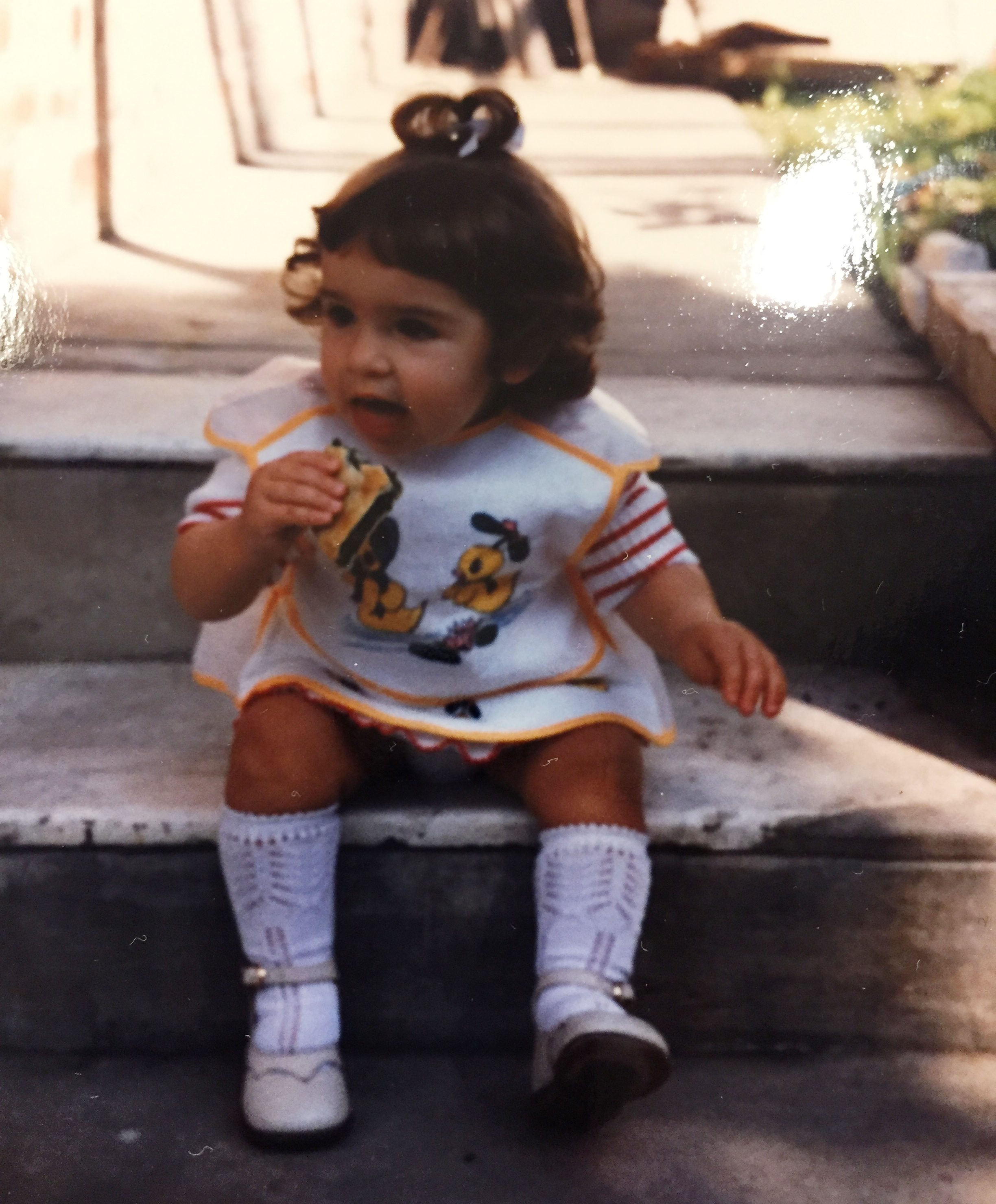 Me eating spanakopita at around 18 months. The only thing that’s really changed is my taste in socks.