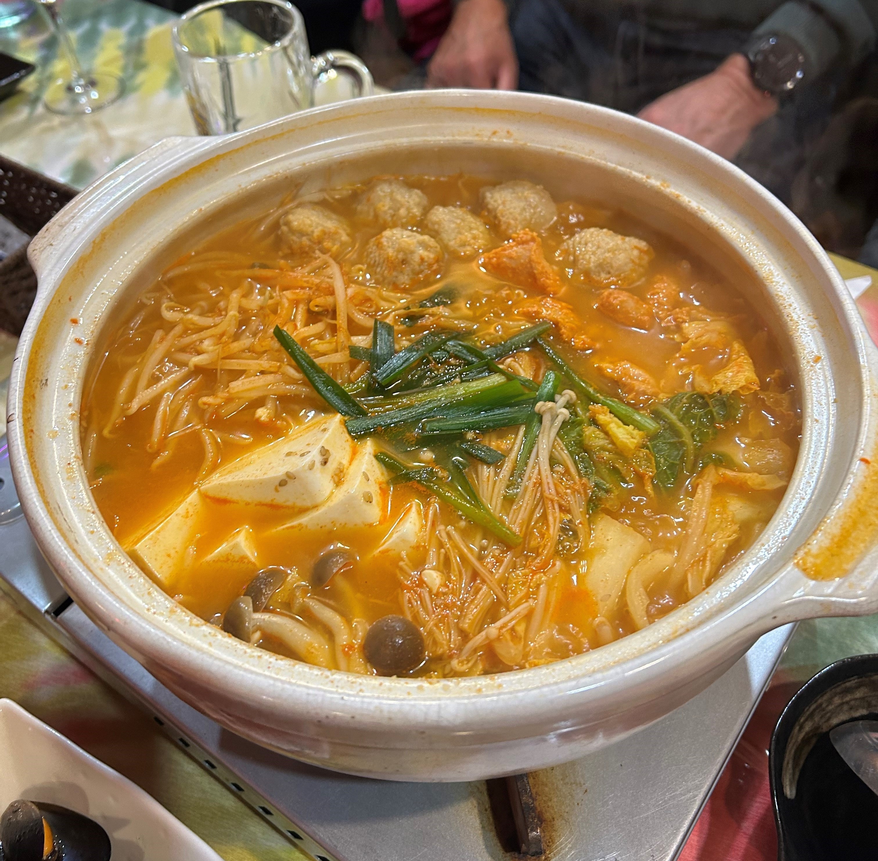 The staff only need to know how many of you there are and then almost instantly, a portable gas stove of bubbling stock filled with goodies appears in front of you. It does its thing for about 20 minutes and when you start to see steam spouting from the sides, its work is done. You’re left with a rich soup that always warms and soothes.