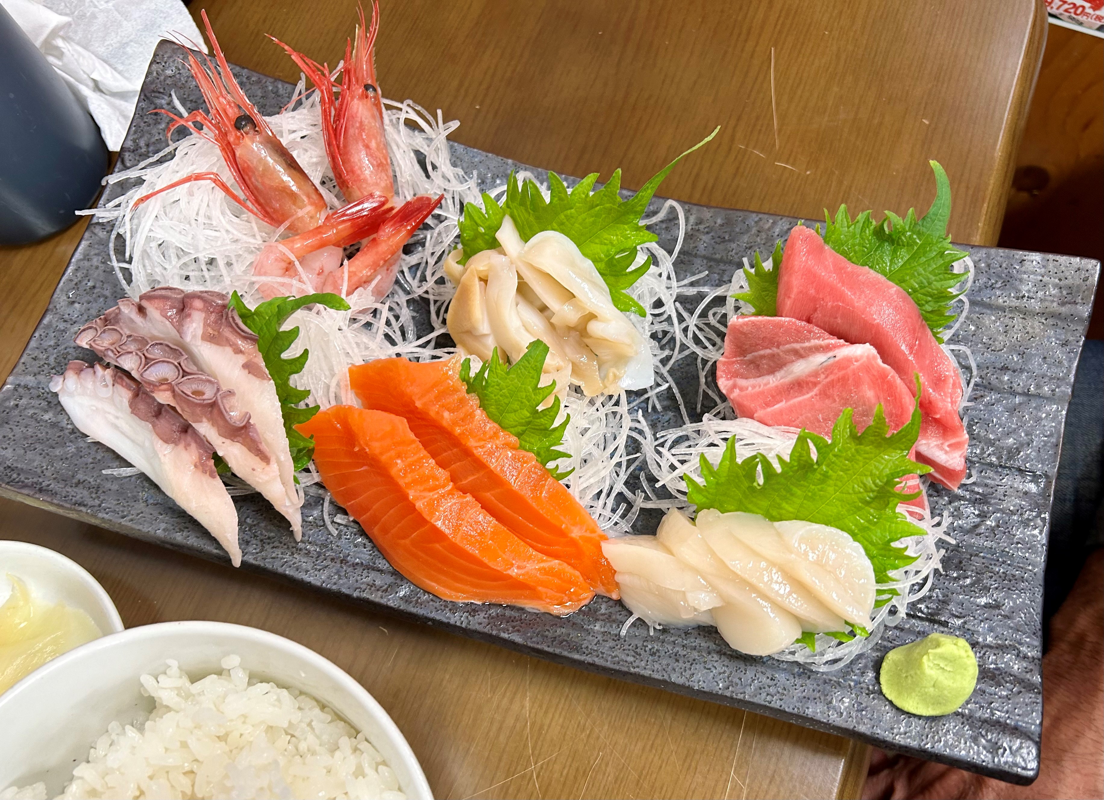 The fish we saw pop up on menus time and time again was atka mackerel or ‘hokke’. It’s a fish that spoils easily which is why we always saw it smoked or dried, opened up like a butterfly. It’s a local delicacy to enjoy this fish grilled on a teppan plate and served with rice, miso and pickles, and it became one of our favourite dishes of the trip.