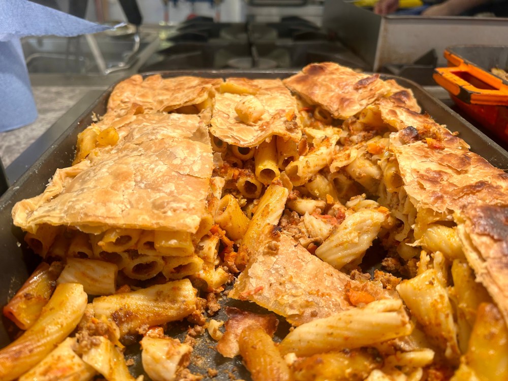 Timpana is a pasta bake with a twist; the pasta and Bolognese sauce are encased in puff pastry to resemble a pie. It loosely resembles Greece’s pastitsio or lasagna, but the pastry is a bit of a curve ball. It’s commonly eaten in squares as a hearty street food lunch. I found it a bit rich and personally don’t think the textures work together.